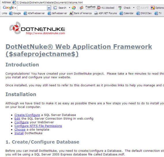 Here is my experience installing a fresh copy of the source version of DotNetNuke 4. This is for installing the "source version" not the "install version" 1. Download "DotNetNuke 4 Source" from DotNetNuke.com 2. Unzip it to "C:\Inetpub\Dotnetnuke4"