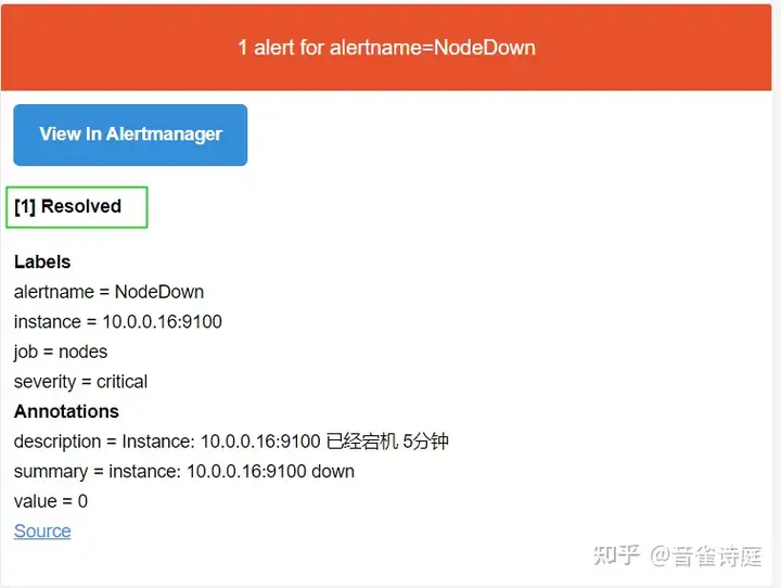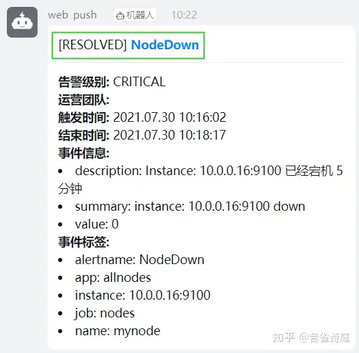 收到恢复警告,因为前面配置文件里设置了 send_resolved: true 如果设置false则不会收到警告