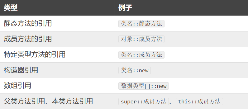 - 函数式接口的实现除了有Lambda表达式外,还有方法引用、构造器引用和数组引用的实现;