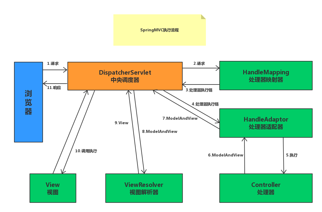 DispatcherServlet(中央调度器)截获所有Http请求,是整个流程的入口,它不直接处理业务逻辑,负责协调各组件完成处理请求。