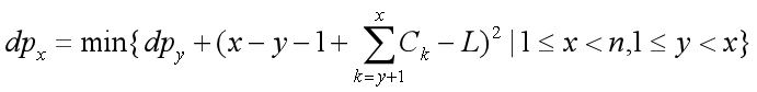 #include<cstdio> #include<iostream> #define int long long using namespace std; int dp[50010]; int n,L,c[50010],s[50010],a[50010]; int front=1,rear=1,q[50010]; inline double slope(int j,int k){ int x1=a[j],y1=dp[j]+(a[j]+1+L)*(a[j]+1+L); int x2=a[k],y2=dp[k]+(a[k]+1+L)*(a[k]+1+L); return double(y1-y2)/double(x1-x2); } inline int f(int x,int y){ return dp[y]+(a[x]-a[y]-1-L)*(a[x]-a[y]-1-L); } signed main(){ ios::sync_with_stdio(false); cin>>n>>L; for(int i=1;i<=n;i++){ cin>>c[i]; s[i]=s[i-1]+c[i]; a[i]=s[i]+i; } for(int i=1;i<=n;i++){ while(front<rear&&slope(q[front],q[front+1])<=2*a[i])front++; dp[i]=f(i,q[front]); while(front<rear&&slope(q[rear],q[rear-1])>slope(i,q[rear]))rear--; q[++rear]=i; } cout<<dp[n]<<endl; return 0; }