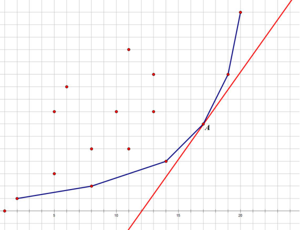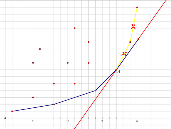 再借助图片理解:无论凸壳里面有多少个点,那条红色的直线都只会先碰到凸壳上的点,即只会在凸壳上的某一个点转移(如下图A点)。