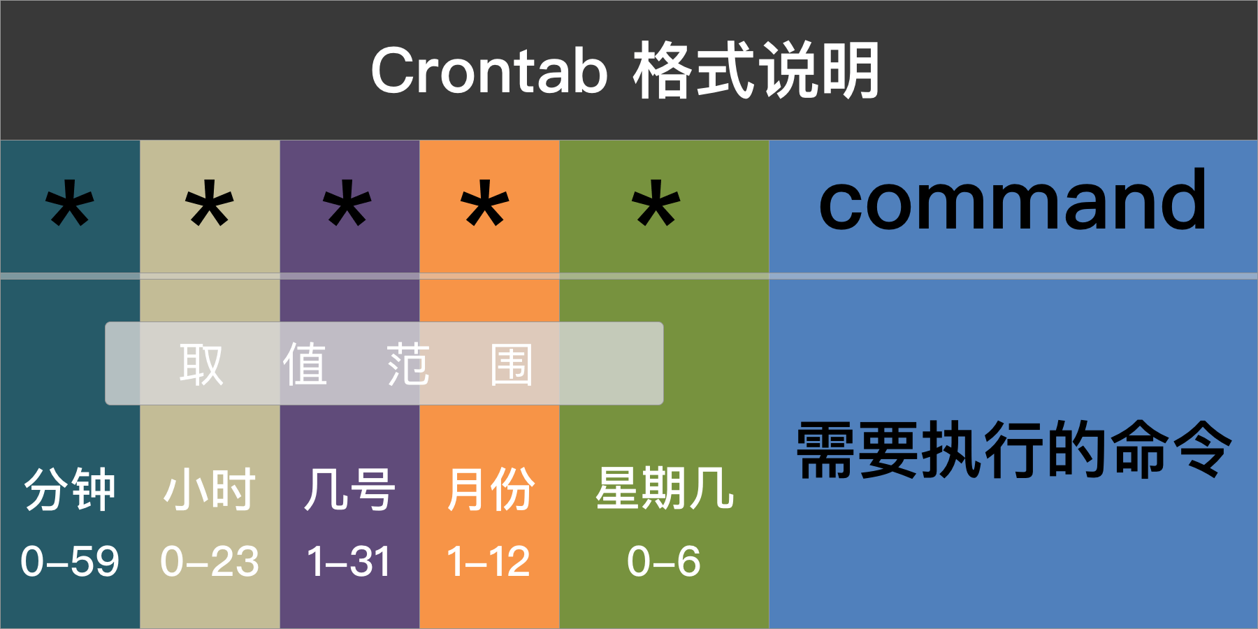 | 分钟 | 小时 | 几号 | 几月 | 星期 | 需要执行的命令 |