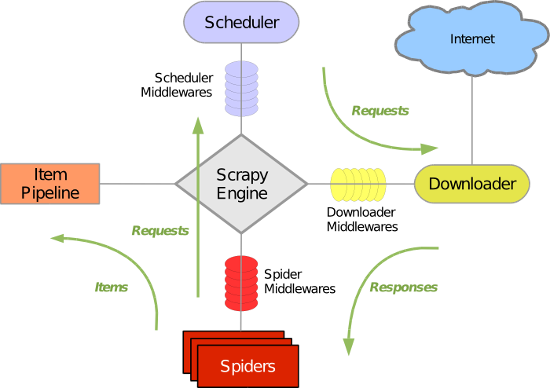 负责处理爬虫从网页中抽取的实体,主要的功能是持久化实体、验证实体的有效性、清除不需要的信息。当页面被爬虫解析后,将被发送到项目管道,并经过几个特定的次序处理数据。 - 下载器中间件(Downloader Middlewares)