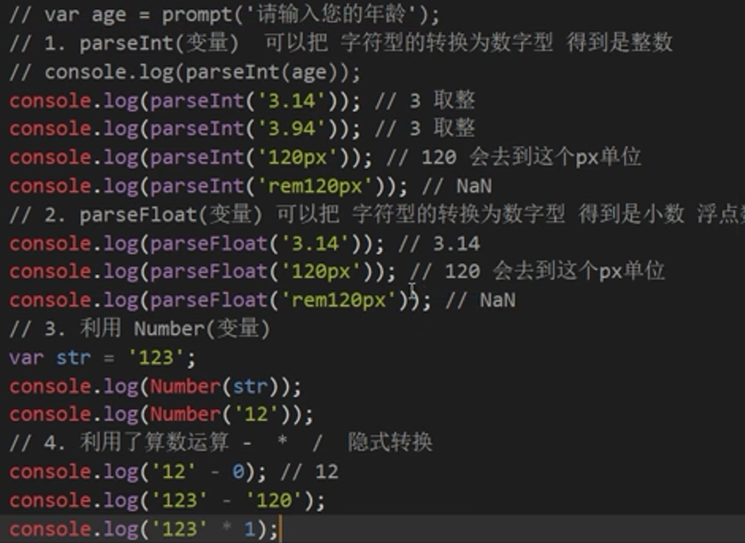 var num1 = 010; //存储八进制数时,在前面加上前导0; console.log(num1);//八进制转10进制; var num2 = 0xa; //存储16进制数时在前面加上前导0x; console.log(num2);//16进制转10进制; //几种极限的特殊情况 console(Number.MAX_VALUE); //数字型最大值 console(Number.MIN_VALUE);//数字型最小值 console(Number.MAX_VALUE * 2); //Infinity 无穷大; console( - Number.MIN_VALUE * 2) // -Infinity 无穷小 console('kfajhksjf' - 100) //NAN 表示非数字
