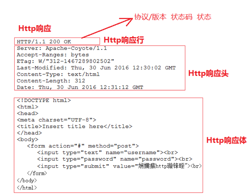 随后Tomcat会将response缓冲区中的内容组装成Http响应返回给浏览器端。