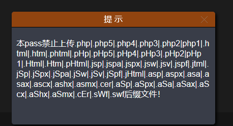 这关查看提示,可以知道黑名单中限制了很多后缀,但是没有.htaccess,我们可以上传.htaccess文件更改apache配置