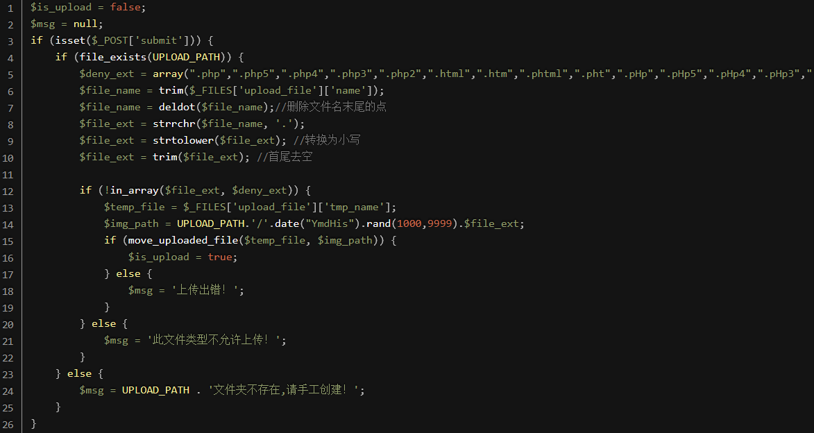 少了这么一行 $file_ext = str_ireplace('::$DATA', '', $file_ext);//去除字符串::$DATA,利用这个特性将用burp抓包,然后将后缀改为.php::$data可以直接绕过检查。