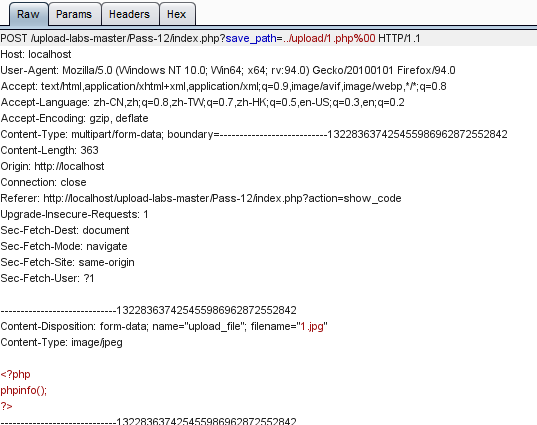 用burp抓包,对其构造sava_path=/upload/1.php%00绕过