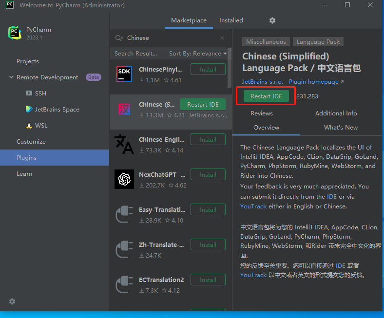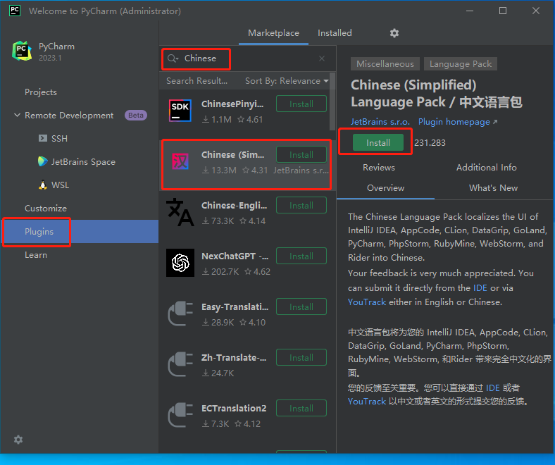 5、点击Plugins,在中间搜索框内输入“Chinese”,选择中文语言包安装,如下图所示。