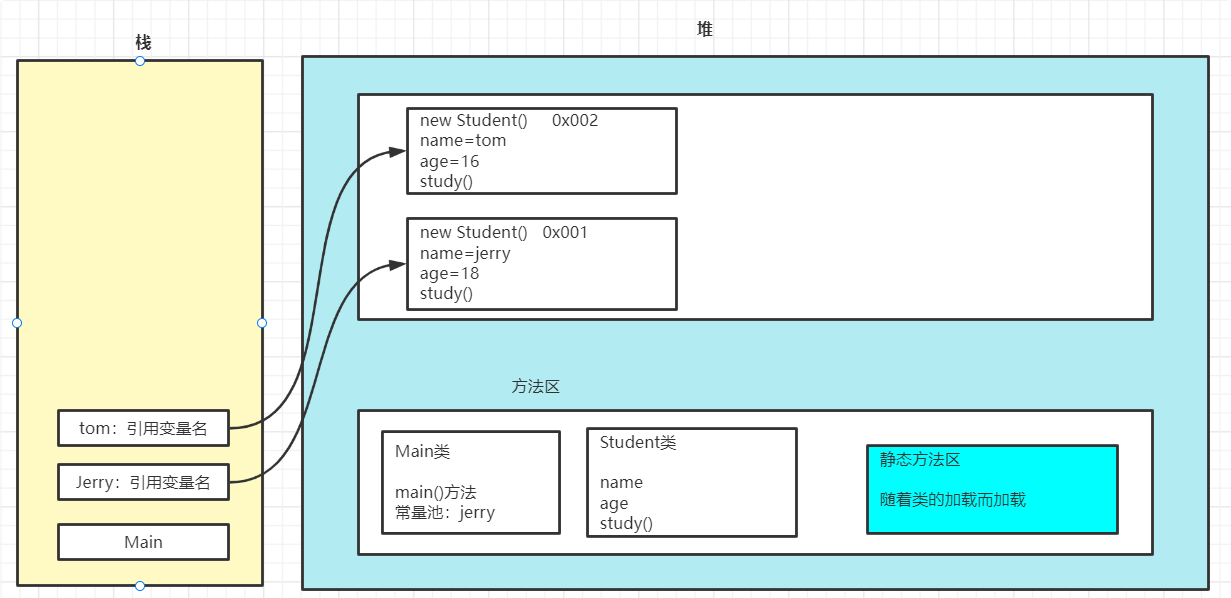 - jvm只有一个堆区(heap)被所有线程共享,堆中不存放基本类型和对象引用,只存放对象本身