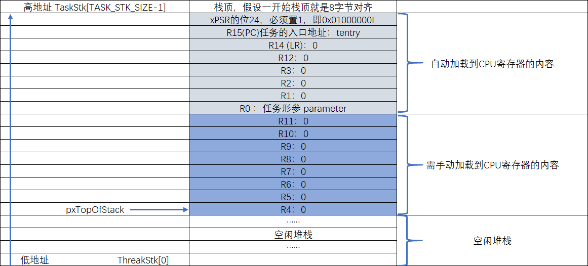 - 代码清单:任务-12 (7):返回栈顶指针,此时pxTopOfStack指向具体见图5‑3。任务第一次运行时,就是从这 个栈指针开始手动加载8个字的内容到CPU寄存器:R4、R5、R6、R7、R8、R9、R10和R11,当退出异常时,栈中剩下 的8个字的内容会自动加载到CPU寄存器:R0、R1、R2、R3、R12、R14、R15和xPSR的位24。此时PC指针就指向了任 务入口地址,从而成功跳转到第一个任务。