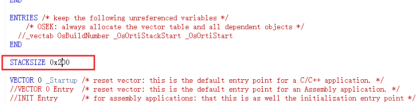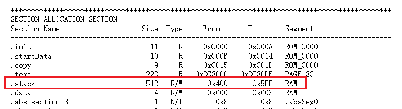 栈大小(stacksize),工程默认为0x100,地址从0x400-0x4FF,可在链接文件prm中修改,如下图所示,修改为0x200后再次编译查看map文件。