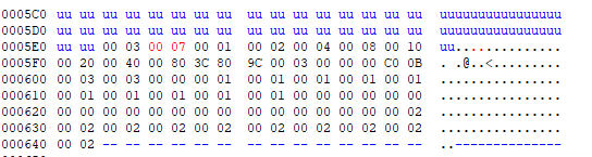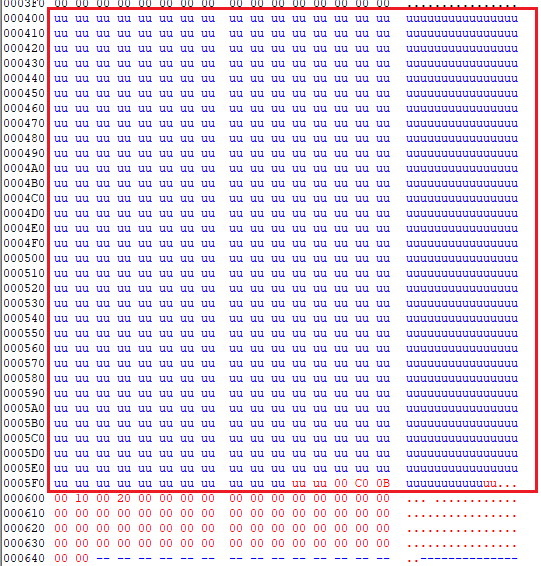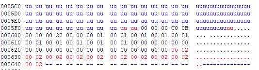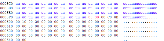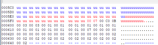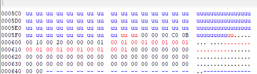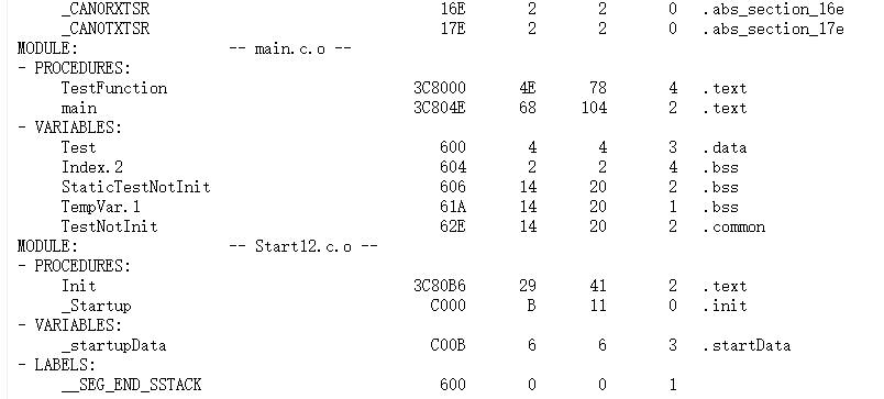 第5行定义的未初始化全局变量数组 TestNotInit[10] ,分配在.common数据段,地址空间为0x62E-0x641,同样为20字节