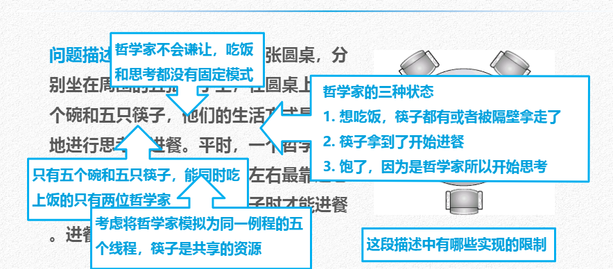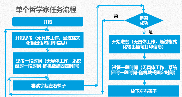 1 #include "stdio.h" 2 #include "stdint.h" 3 #include "stdlib.h" 4 #include "pthread.h" 5 #include "sys/types.h" 6 #include "sys/wait.h" 7 //#include <stdlib.h> 8 #include "unistd.h" 9 10 #define PH_NUM (5u) /* 哲学家数量 */ 11 #define THINKING_TIME (2u) /* 思考时间 */ 12 #define EATING_TIME (2u) /* 进餐时间 */ 13 14 static uint8_t table[PH_NUM] = {0}; 15 pthread_mutex_t tableMutex; 16 17 //尝试拿起筷子,1-成功拿起 0-筷子已被其他人拿起 18 static uint8_t takechopstick(int number) 19 { 20 uint8_t ret = 0; 21 22 if(0 == pthread_mutex_trylock(&tableMutex)) 23 { 24 if(number >= sizeof(table)) number = 0; 25 if(table[number]) ret = 0; 26 else 27 { 28 table[number] = 1; 29 ret = 1; 30 } 31 32 if(0 == pthread_mutex_unlock(&tableMutex)) 33 /*printf("taking %d chopstick is successful\n",number)*/; 34 }else /*printf("taking %d chopstick is failure\n",number)*/; 35 36 return ret; 37 } 38 //放下筷子 39 static void putchopstick(int number) 40 { 41 if(0 == pthread_mutex_lock(&tableMutex)) 42 { 43 if(number >= sizeof(table)) number = 0; 44 if(table[number]) 45 table[number] = 0; 46 47 if(0 == pthread_mutex_unlock(&tableMutex)) 48 /*printf("putting %d chopstick is successful\n",number)*/; 49 } 50 } 51 52 //单哲学家任务 53 void *philosopher(int *Ptr) 54 { 55 int number = *Ptr; 56 while(1) 57 { 58 printf("philosopher %d is thinking\n",number); 59 sleep(THINKING_TIME); 60 if(takechopstick(number)) 61 { 62 if(takechopstick((int)((number + 1)%(sizeof table)))) 63 { 64 printf("philosopher %d is eating\n",number); 65 sleep(EATING_TIME); 66 putchopstick(number); 67 putchopstick((int)((number + 1)%(sizeof table))); 68 } 69 else 70 { 71 //printf("philosopher %d taking %d chopstick failure\n",(int)((number + 1)%(sizeof table)),(int)((number + 1)%(sizeof table))); 72 putchopstick(number); 73 } 74 } 75 else /*printf("philosopher %d taking %d chopstick failure\n",number,number)*/; 76 } 77 return 0; 78 } 79 80 int main(int argc ,char ** argv) 81 { 82 const int PHList[PH_NUM] = {0,1,2,3,4}; 83 pthread_t tid[PH_NUM]; 84 printf("create mainThread\n"); 85 if(0 == pthread_mutex_init(&tableMutex,NULL)) 86 printf("mutex init is successful\n"); 87 else 88 printf("mutex init is failure\n"); 89 //sprintf(str,"str from parent"); 90 for(int i = 0; i < PH_NUM; i++) 91 pthread_create(&(tid[i]),NULL,(void *)philosopher,(void *)&(PHList[i])); 92 93 pthread_join(tid[4],NULL); 94 pthread_mutex_destroy(&tableMutex); 95 printf("mainThread exit \n"); 96 97 return 0; 98 }