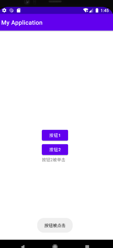 package com.example.myapplication; import androidx.appcompat.app.AppCompatActivity; import android.annotation.SuppressLint; import android.os.Bundle; import android.view.View; import android.widget.Button; import android.widget.TextView; import android.widget.Toast; public class MainActivity extends AppCompatActivity { Button btn01;//声明控件变量 TextView text01; Button but02; @Override protected void onCreate(Bundle savedInstanceState) { super.onCreate(savedInstanceState); setContentView(R.layout.activity_main); btn01 = (Button) findViewById(R.id.but_1);//关联控件 but02 = findViewById(R.id.but_2); text01 = findViewById(R.id.text1); //注册监听 View.OnClickListener oc_1 = new View.OnClickListener() { @SuppressLint("WrongConstant") @Override public void onClick(View view) { //当监听到按钮被点击后,立即执行内部代码 Toast.makeText(MainActivity.this, "按钮被点击", 1).show(); } }; //设置监听 btn01.setOnClickListener(oc_1); View.OnClickListener oc_2 = new View.OnClickListener() { @Override public void onClick(View view) { text01.setText("按钮2被单击"); } }; but02.setOnClickListener(oc_2); } }