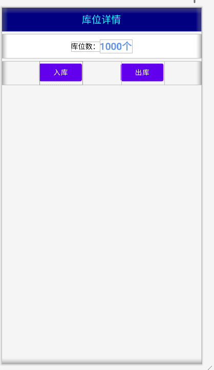 <?xml version="1.0" encoding="utf-8"?> <LinearLayout xmlns:android="http://schemas.android.com/apk/res/android" xmlns:app="http://schemas.android.com/apk/res-auto" xmlns:tools="http://schemas.android.com/tools" android:layout_width="match_parent" android:layout_height="match_parent" android:orientation="vertical" tools:context=".MainActivity" android:background="#F5F5F5"> <LinearLayout android:layout_width="match_parent" android:layout_height="50dp" android:background="#000080"> <TextView android:layout_width="match_parent" android:layout_height="match_parent" android:text="库位详情" android:textColor="#00F5FF" android:textSize="20sp" android:gravity="center"/> </LinearLayout> <LinearLayout android:layout_width="match_parent" android:layout_height="50dp" android:layout_marginTop="5dp" android:background="#FFFFFF" android:gravity="center"> <TextView android:layout_width="wrap_content" android:layout_height="wrap_content" android:text="库位数:" android:textColor="#000000" android:textSize="15sp" /> <TextView android:layout_width="wrap_content" android:layout_height="wrap_content" android:text="1000个" android:textColor="#6495ED" android:textSize="20sp" android:textStyle="bold" /> </LinearLayout> <LinearLayout android:layout_width="match_parent" android:layout_height="wrap_content" android:gravity="center" android:layout_marginTop="5dp"> <Button android:layout_width="wrap_content" android:layout_height="wrap_content" android:text="入库" /> <Button android:layout_width="wrap_content" android:layout_height="wrap_content" android:layout_marginLeft="80dp" android:text="出库" /> </LinearLayout> </LinearLayout>