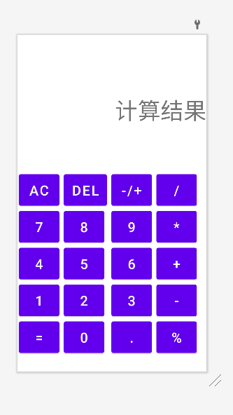 <?xml version="1.0" encoding="utf-8"?> <RelativeLayout xmlns:android="http://schemas.android.com/apk/res/android" android:layout_width="match_parent" android:layout_height="match_parent"> <TextView android:id="@+id/tv_1" android:layout_width="match_parent" android:layout_height="wrap_content" android:layout_marginTop="130dp" android:layout_marginBottom="100dp" android:gravity="right|bottom" android:text="计算结果" android:textSize="50sp" /> <Button android:id="@+id/but_1" android:layout_width="wrap_content" android:layout_height="80dp" android:layout_below="@id/tv_1" android:layout_marginLeft="3dp" android:text="AC" android:textSize="30sp" /> <Button android:id="@+id/but_2" android:layout_width="wrap_content" android:layout_height="80dp" android:layout_alignBottom="@id/but_1" android:layout_marginLeft="10dp" android:layout_toRightOf="@id/but_1" android:text="DEL" android:textSize="30sp" /> <Button android:id="@+id/but_3" android:layout_width="wrap_content" android:layout_height="80dp" android:layout_alignBottom="@id/but_2" android:layout_marginLeft="10dp" android:layout_toRightOf="@id/but_2" android:text="-/+" android:textSize="30sp" /> <Button android:id="@+id/but_8" android:layout_width="wrap_content" android:layout_height="80dp" android:layout_alignBottom="@id/but_3" android:layout_marginLeft="10dp" android:layout_toRightOf="@id/but_3" android:text="/" android:textSize="30sp" /> <Button android:id="@+id/but_4" android:layout_width="wrap_content" android:layout_height="80dp" android:layout_below="@id/but_1" android:layout_alignLeft="@id/but_1" android:text="7" android:textSize="30sp" /> <Button android:id="@+id/but_5" android:layout_width="wrap_content" android:layout_height="80dp" android:layout_below="@id/but_2" android:layout_alignLeft="@id/but_2" android:text="8" android:textSize="30sp" /> <Button android:id="@+id/but_6" android:layout_width="wrap_content" android:layout_height="80dp" android:layout_below="@id/but_3" android:layout_alignLeft="@id/but_3" android:text="9" android:textSize="30sp" /> <Button android:id="@+id/but_7" android:layout_width="wrap_content" android:layout_height="80dp" android:layout_below="@id/but_8" android:layout_alignLeft="@id/but_8" android:text="*" android:textSize="30sp" /> <Button android:id="@+id/but_9" android:layout_width="wrap_content" android:layout_height="80dp" android:layout_below="@id/but_4" android:layout_alignLeft="@id/but_4" android:text="4" android:textSize="30sp" /> <Button android:id="@+id/but_10" android:layout_width="wrap_content" android:layout_height="80dp" android:layout_below="@id/but_5" android:layout_alignLeft="@id/but_5" android:text="5" android:textSize="30sp" /> <Button android:id="@+id/but_11" android:layout_width="wrap_content" android:layout_height="80dp" android:layout_below="@id/but_6" android:layout_alignLeft="@id/but_6" android:text="6" android:textSize="30sp" /> <Button android:id="@+id/but_12" android:layout_width="wrap_content" android:layout_height="80dp" android:layout_below="@id/but_7" android:layout_alignLeft="@id/but_7" android:text="+" android:textSize="30sp" /> <Button android:id="@+id/but_13" android:layout_width="wrap_content" android:layout_height="80dp" android:layout_below="@id/but_9" android:layout_alignLeft="@id/but_9" android:text="1" android:textSize="30sp" /> <Button android:id="@+id/but_14" android:layout_width="wrap_content" android:layout_height="80dp" android:layout_below="@id/but_10" android:layout_alignLeft="@id/but_10" android:text="2" android:textSize="30sp" /> <Button android:id="@+id/but_15" android:layout_width="wrap_content" android:layout_height="80dp" android:layout_below="@id/but_11" android:layout_alignLeft="@id/but_11" android:text="3" android:textSize="30sp" /> <Button android:id="@+id/but_16" android:layout_width="wrap_content" android:layout_height="80dp" android:layout_below="@id/but_12" android:layout_alignLeft="@id/but_12" android:text="-" android:textSize="30sp" /> <Button android:id="@+id/but_17" android:layout_width="wrap_content" android:layout_height="80dp" android:layout_below="@id/but_13" android:layout_alignLeft="@id/but_13" android:text="=" android:textSize="30sp" /> <Button android:id="@+id/but_18" android:layout_width="wrap_content" android:layout_height="80dp" android:layout_below="@id/but_14" android:layout_alignLeft="@id/but_14" android:text="0" android:textSize="30sp" /> <Button android:id="@+id/but_19" android:layout_width="wrap_content" android:layout_height="80dp" android:layout_below="@id/but_15" android:layout_alignLeft="@id/but_15" android:text="." android:textSize="30sp" /> <Button android:id="@+id/but_20" android:layout_width="wrap_content" android:layout_height="80dp" android:layout_below="@id/but_16" android:layout_alignLeft="@id/but_16" android:text="%" android:textSize="30sp" /> </RelativeLayout>