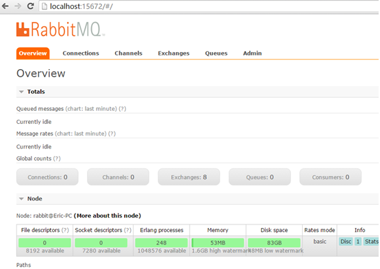最后浏览器打开http://localhost:15672访问RabbitMQ的管理控制台,使用默认用户名guest和密码guest登录