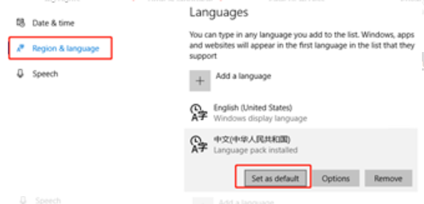 5、安装过程大概需要半小时左右,安装完成后在设置中选择Region&language(地区和语言),选择中文,并点击Set as default(设置为默认语言),设置后重启生效.