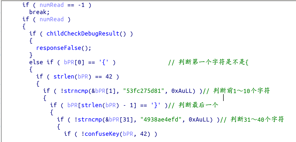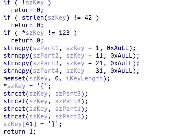 主要是四个strcat函数,这是将正确的flag以10个为一组进行顺序打乱 。打乱后的顺序位 3 4 1 2。打乱的flag为 "{daf29f59034938ae4efd53fc275d81053ed5be8c}"就是前面代码中出现的