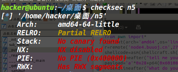 重点是 RWX: HasRWX segments 有这个基本就是ret2shellcode。因为程序中存在 可读可写可执行的片段这很危险的;