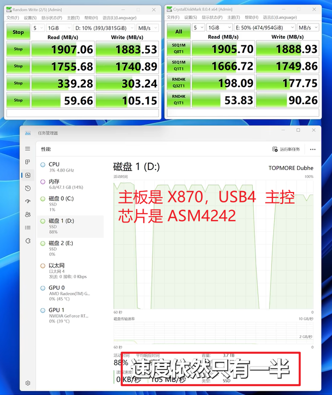 主板 X870,USB4 主控芯片是 ASM4242,对比雷电4 的跑分