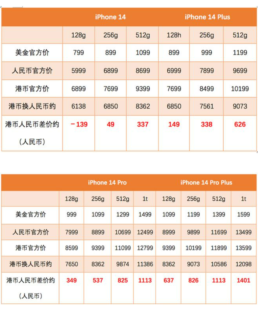 港版 iPhone 14、iPhone 14 Plus、iPhone 14 Pro、iPhone 14 Pro Plus 的定价