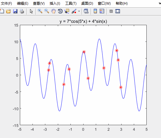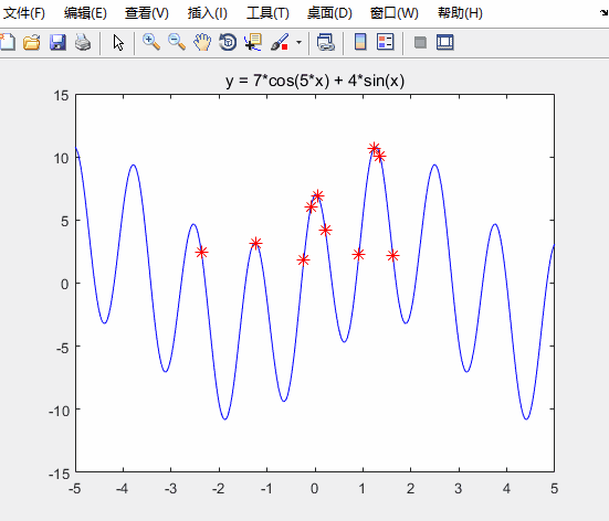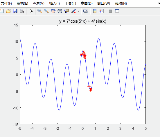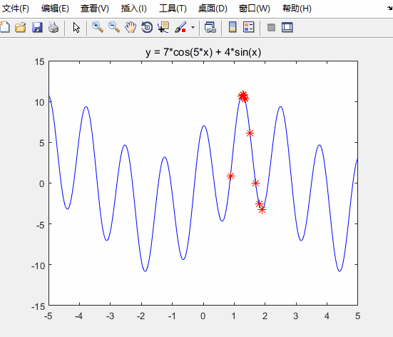 求解函数y = 7cos(5x) + 4*sin(x)在[-5,5]内的最大值