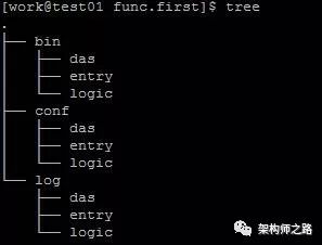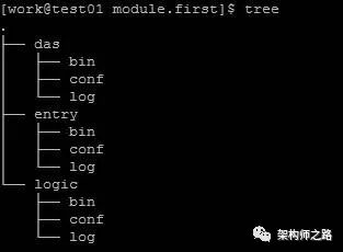 在模块目录下,又分别有存放可执行文件,配置文件,日志文件的bin目录,conf目录,以及log目录