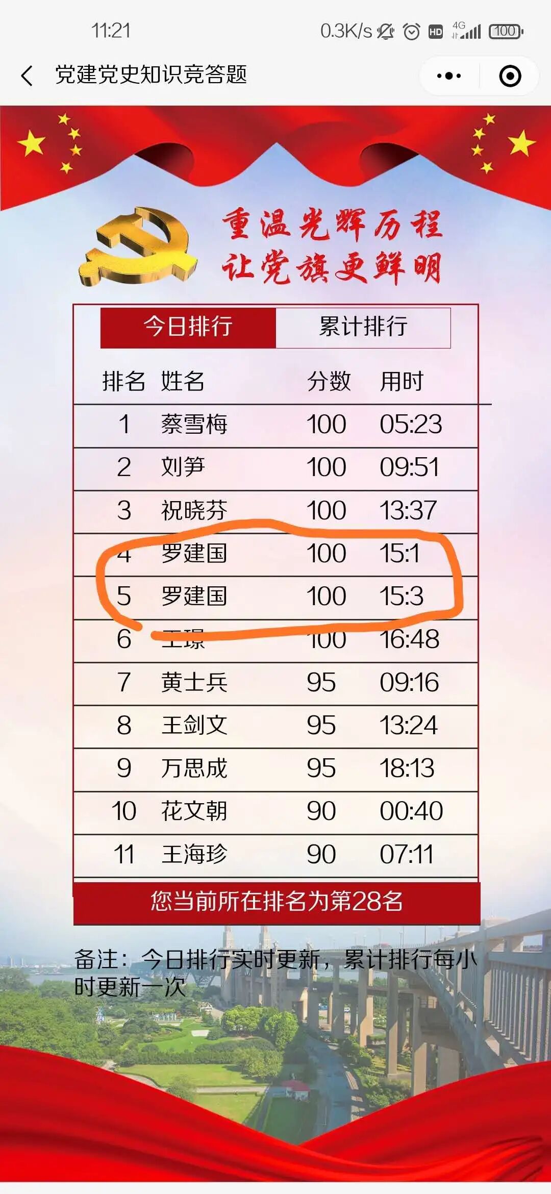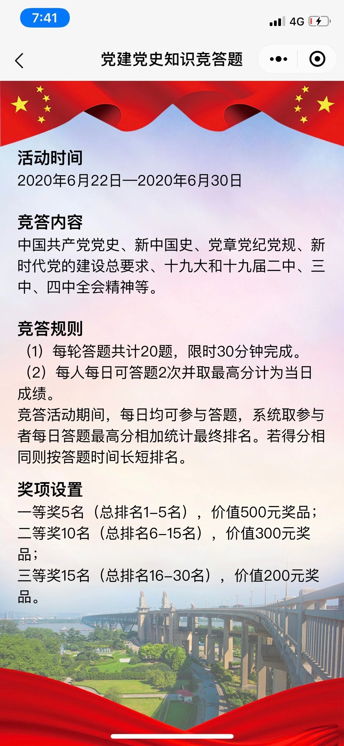 - 每人每日可答题2次并取最高分计为当日成绩。竞答活动期间,每日均可参与答题,系统取参与者每日答题最高分相加统计最终排名。若得分相同则按答题时间长短排名。