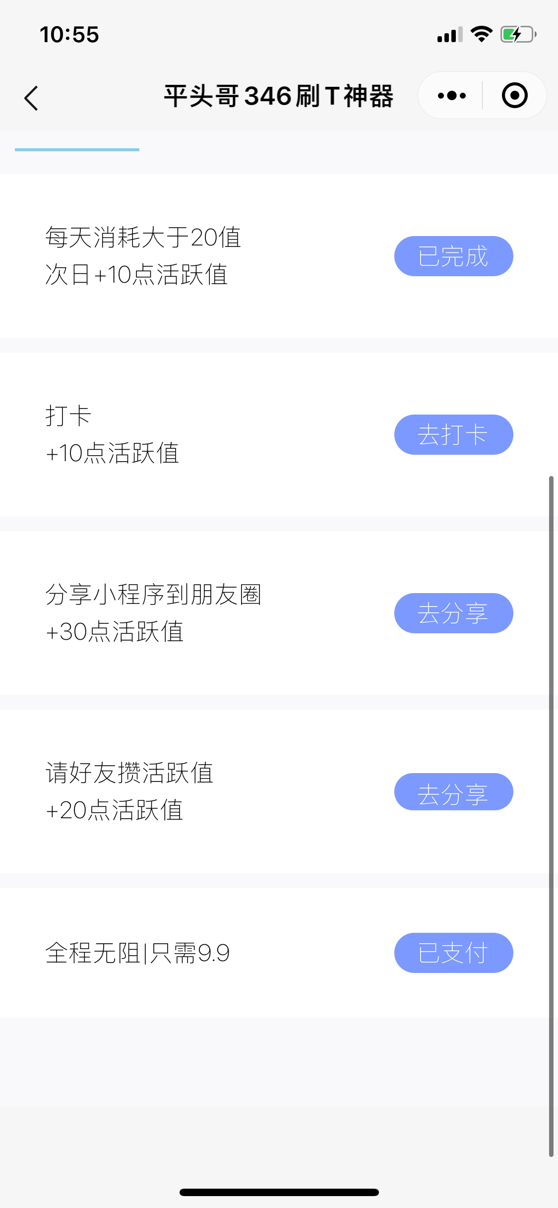 积分是该小程序除了答题核心逻辑之外非常重要的一个模块,目前小程序可以通过以下行为活动积分,也就是活跃值