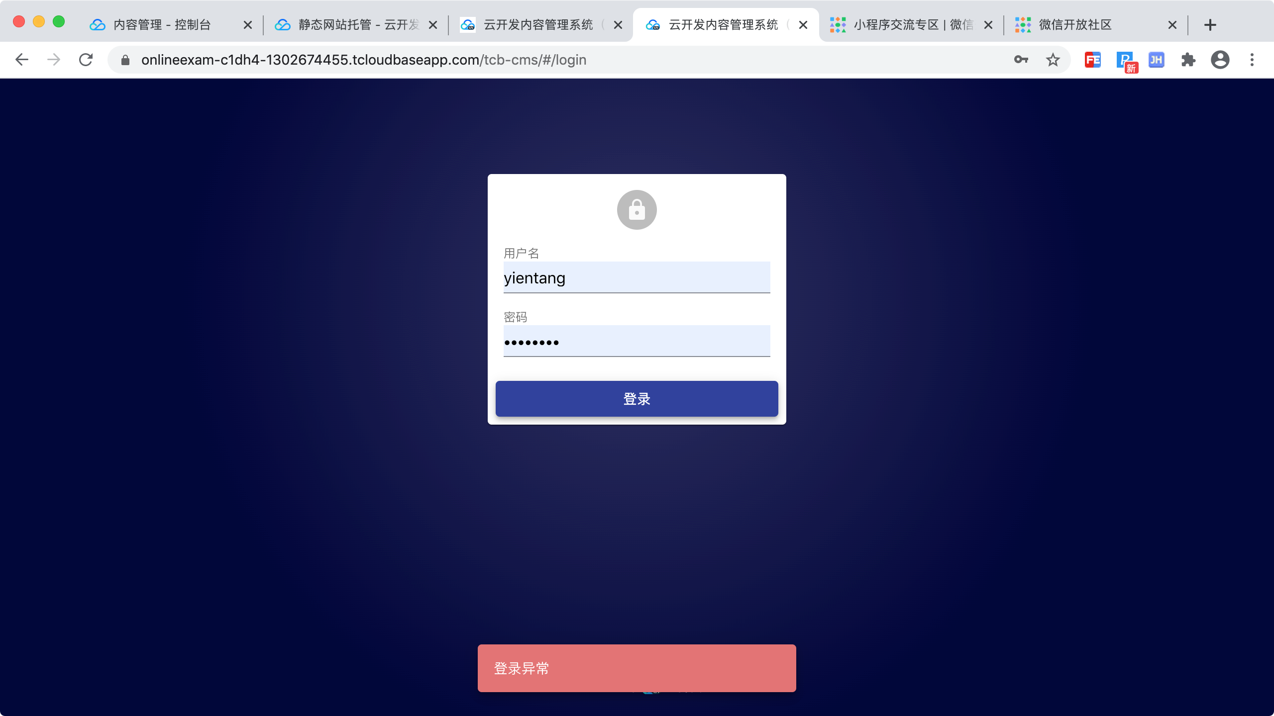 安装好CMS之后,用账号,密码登录,报登录异常,