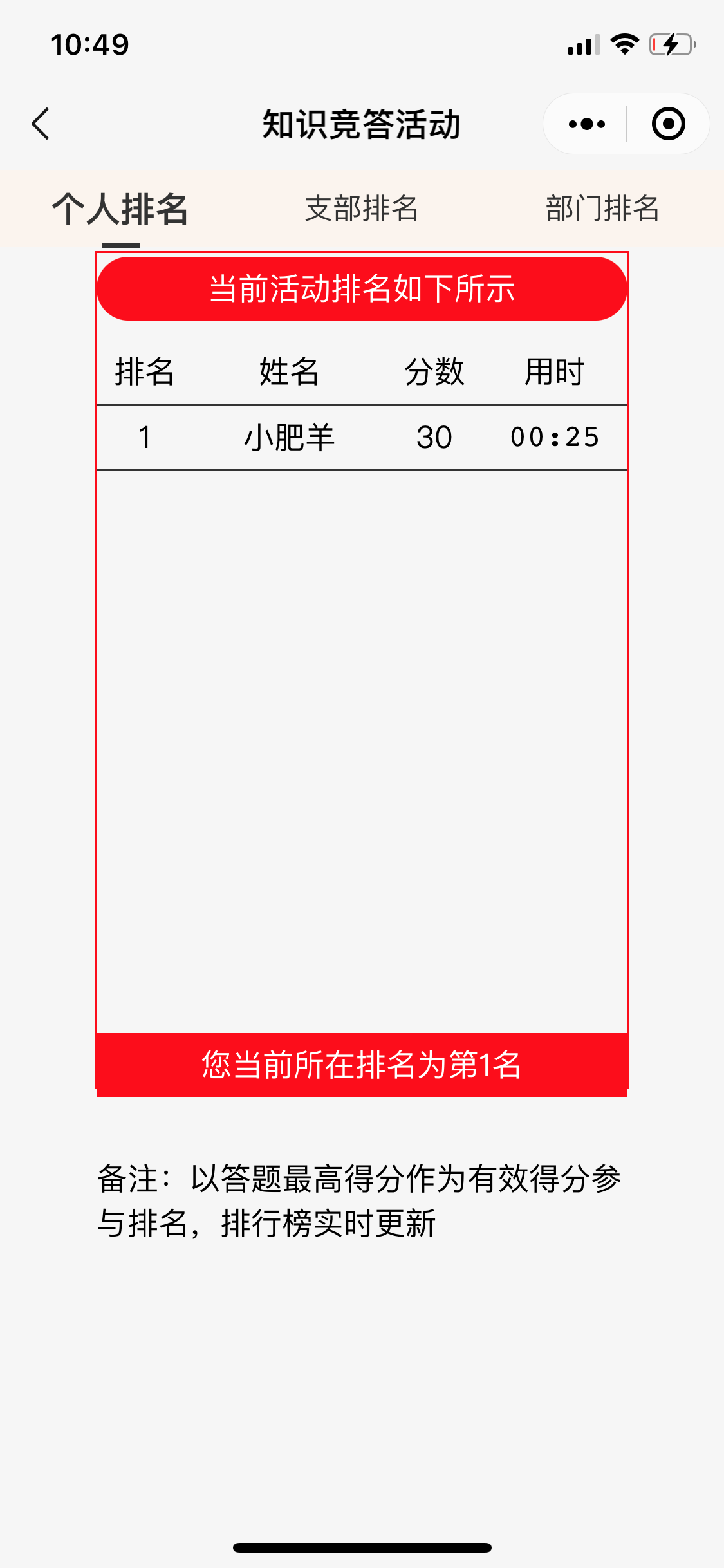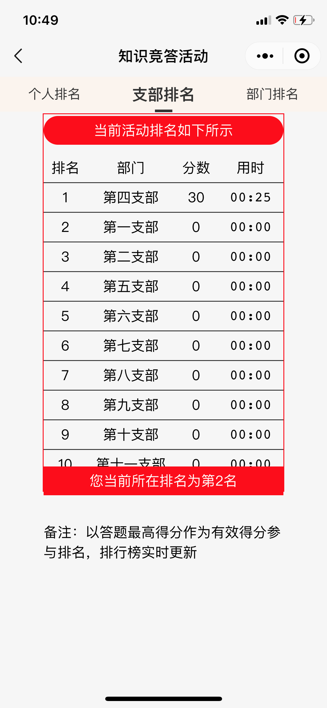 今天主要在排名界面对小程序进行了重构,使其支持按支部和部门来展示排名信息,具体截图如下所示