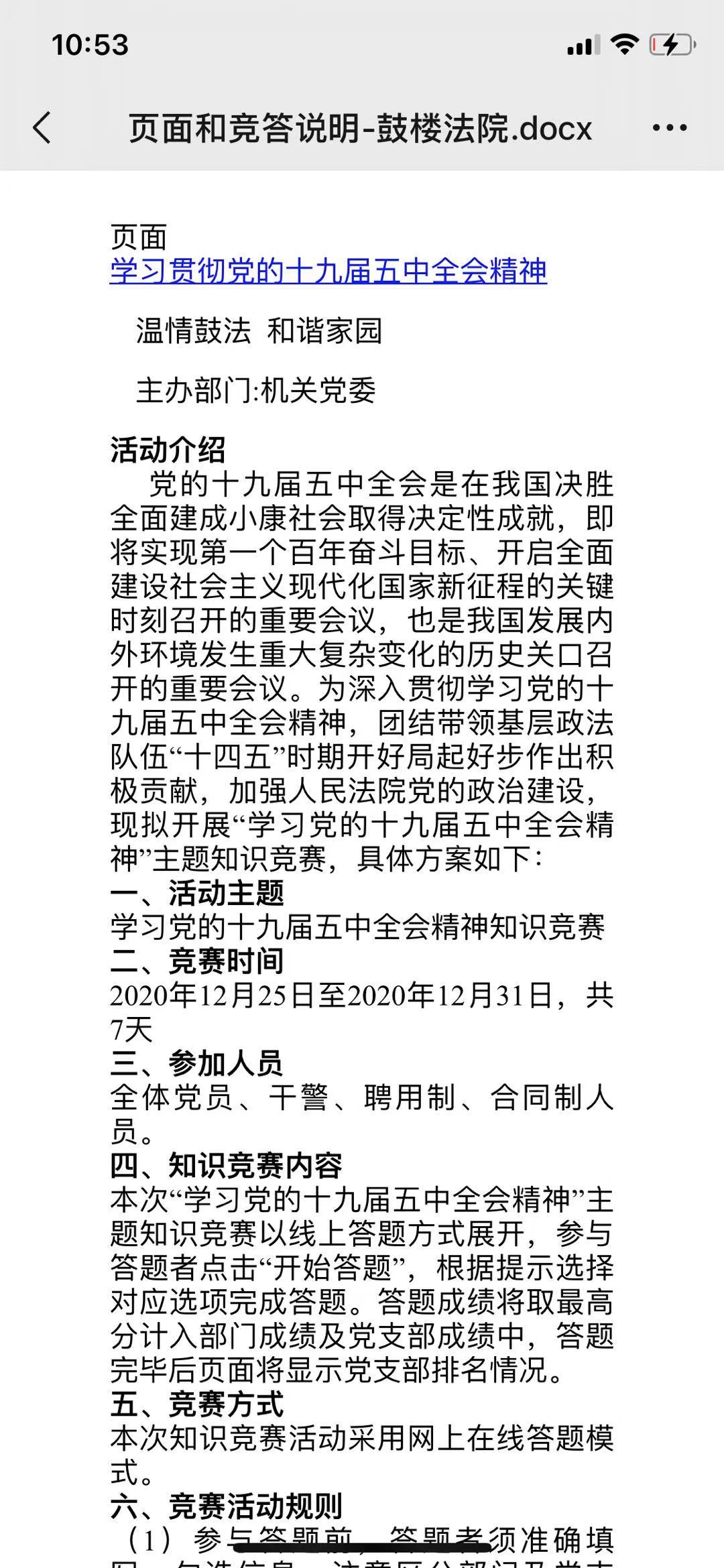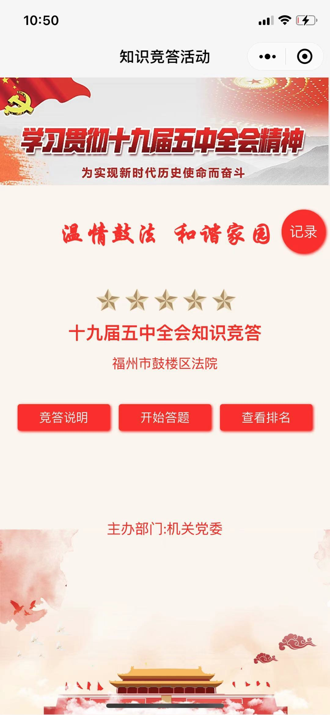 本次承办答题活动为福州市中级人民法院关于学习贯彻十九届五种全会精神的答题,该答题活动从12月25号-12月31号开始,持续时间为7天。