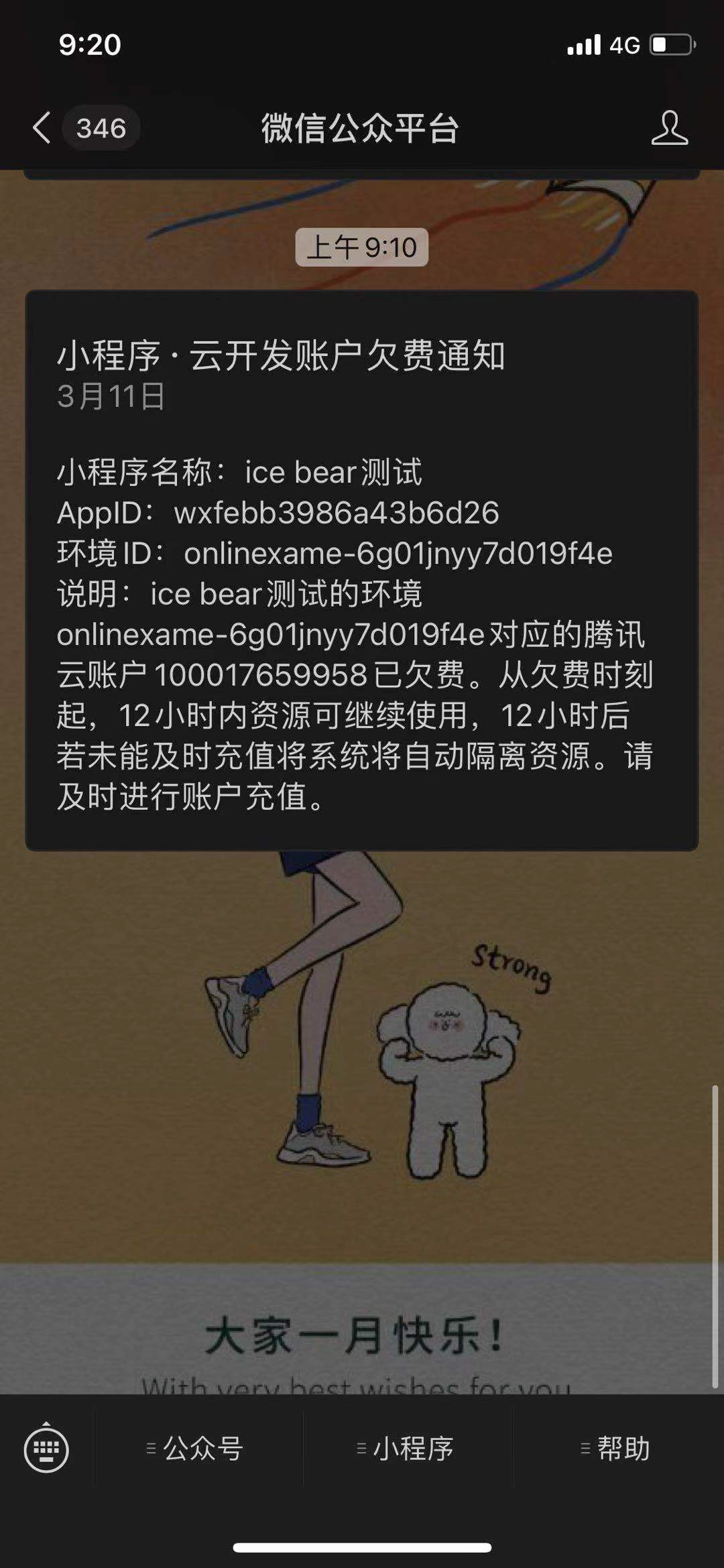 是这样的,今天一大早就收到微信公众平台的推送通知,提醒欠费了,大概我能猜到,因为目前云开发 的免费套餐只有500次读一天,缴费是早完事的事