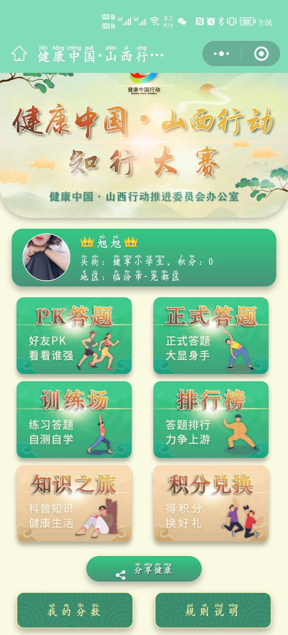 以“喜迎 健康享未来”为主题,健康中国·山西行动知行大赛线上答题活动紧紧围绕健康知识普及、合理膳食、全民健身、心理健康、慢性病预防控制、中医药健康促进等健康中国·山西行动16个专项行动内容,汇集近3000道题目及上百篇科普文章,通过发动广大党员干部群众参与互动,以达到“普及知识、提升素养、全民参与、共建共享”的目标,唱响深入实施健康中国行动、全面推进健康山西建设的主旋律。