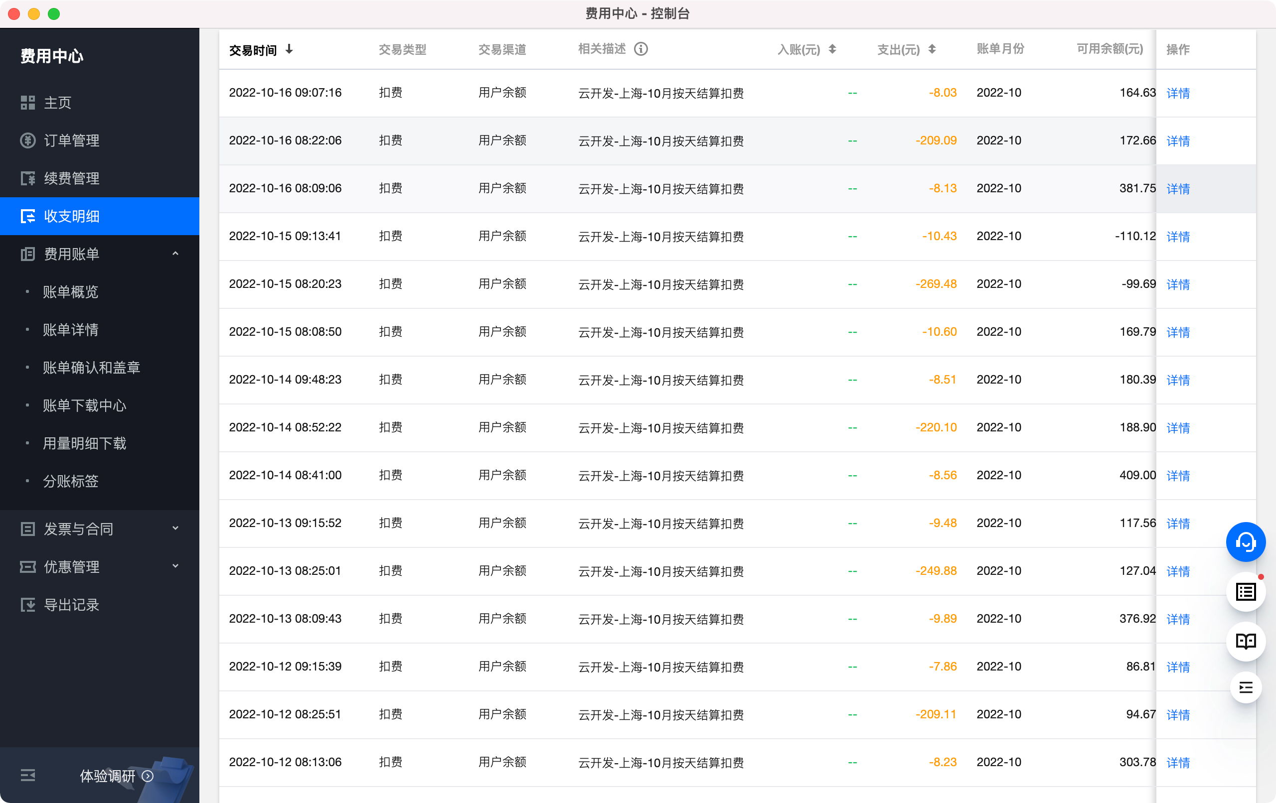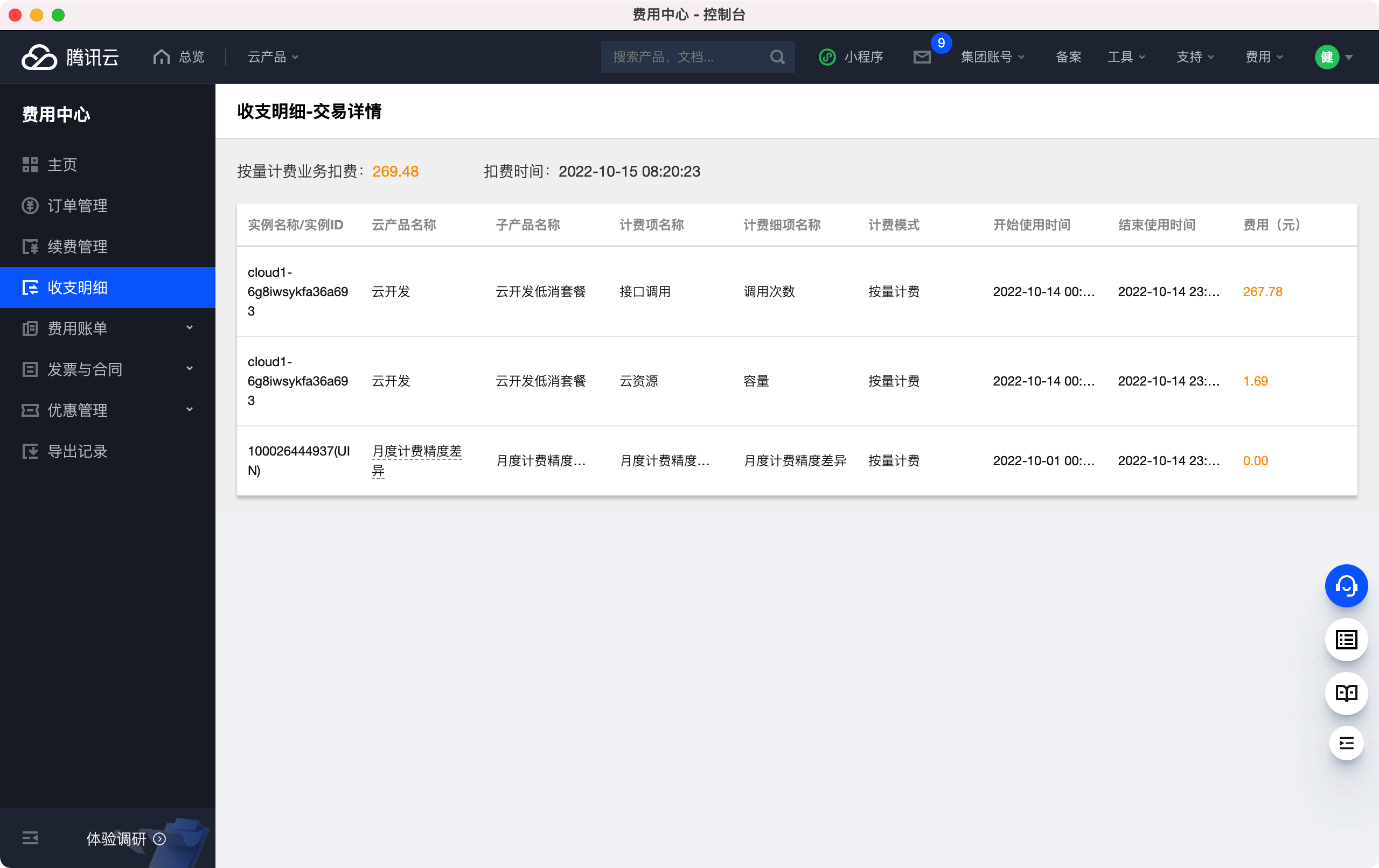 20221014是日活做多的一天接近10万,单日扣费为267元,每万日活收费大概在26.7,从下图我们看到单日收费的大头在调用次数这个单项,从收费标准来看每万次调用0.5元。