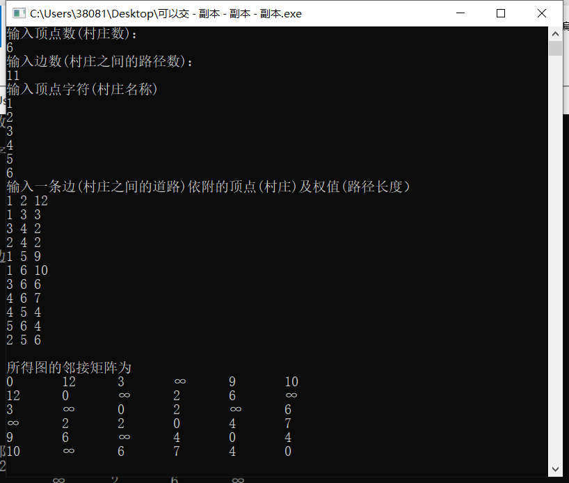 #include<iostream> #define INFINITY 10000//最大数 using namespace std; const int maxEdges=50; const int maxVertices=100; //最大顶点数 struct PathWay{ double dist;//权值 }; class MyGraph { private: int vNum;//当前顶点数 int eNum;//当前边数 char Vertex[maxVertices];//顶点数组 PathWay Edge[maxVertices][maxVertices];//边数组 public: void Create(int size = maxEdges);//构造函数 bool FindVertex(int vertex); bool InsertVertex(int vertex);//插入一个顶点vertex bool InsertEdge(const int v1,const int v2,const int weight);//插入一条边(v1,v2),该边上的权值为weight bool GetVertexPos(const int &vertex,int &i);//给出顶点vertex在图中的位置 void Floyd();//Floyd算法 void Print();//输出邻接矩阵 void short_compare(double farthest[]);//求出最短路径 double far_compare(double shortest[]);//这个问题的答案,在short_compare函数中选出一个最小的值 }; void MyGraph::Create(int size)//将图转化成邻接矩阵保存 { int n,e;//n是村庄数,e是边数 char name,tail,head; int weight; for(int i=0;i<size;i++){ for(int j=0;j<size;j++) { if(i==j){ Edge[i][j].dist=0;//初始化顶点到自身权值为0 } else{ Edge[i][j].dist=INFINITY;//初始化邻接矩阵其余顶点为最大值 } } } cout<<"请输入总顶点数(村庄):"; cin>>n; while(cin.fail()){ cin.clear(); char temp[100]; cin.getline(temp,100); cout<<endl; cout<<"Error:您输入的不是数字."<<endl<<"请重新输入:"; cin>>n; cout<<endl; } cout<<"请输入总边数(路径):"; cin>>e; while(cin.fail()){ cin.clear(); char temp[100]; cin.getline(temp,100); cout<<endl; cout<<"Error:您输入的不是数字."<<endl<<"请重新输入:"; cin>>e; cout<<endl; } cout<<endl; cout<<"请输入顶点名称:"<<endl; for(int i=0;i<n;i++)//依次输入顶点,插入图中 { cout<<"请输入第"<<i+1<<"个顶点(村庄)的名称:"; cin>>name; InsertVertex(name); vNum++; } cout<<endl; cout<<"请输入头尾两个顶点(村庄)和权值(路径)[分别用空格隔开]:"<<endl; for(int i=0;i<e;i++){ cin>>head>>tail>>weight; if(!InsertEdge(head,tail,weight)) { cout<<"不存在该边,请重新输入这条边:"; i--; continue; } } cout<<endl; } void MyGraph::short_compare(double farthest[]){ //比较数组(当前村庄和其他村庄间最短距离的集合中最大值的集合)中的最小值。选择使离医院最远的村庄到医院的路程最短 double route=farthest[0]; int point=0; for (int i=0; i<vNum; i++) { if (farthest[i]<route) { route=farthest[i]; point=i; } } cout<<"所以医院应该建在村庄:"<<Vertex[point]<<endl; } double MyGraph::far_compare(double s[]){//得到最远村庄的距离 double max=s[0]; int k; for(k=0;k<vNum;k++){ if(s[k]>max){ max=s[k]; } } return max; } bool MyGraph::FindVertex(int vertex)//给出顶点vertex在图中的位置,这里也可以用来判断在插入的时候是否已经有顶点了 { for (int i = 0; i < vNum; i++){ if (vertex == Vertex[i]){ return true; } } return false; } bool MyGraph::InsertVertex(int vertex)//插入顶点 { if (FindVertex(vertex)){ return false; } else{ Vertex[vNum] = vertex; return true; } } bool MyGraph::GetVertexPos(const int& vertex,int &i)//这个点是否在这条边上 { for (i = 0; i < vNum; i++){ if (vertex == Vertex[i]){ return true; } } return false; } bool MyGraph::InsertEdge(int v1,int v2,int weight)//插入一条边 { int k=0,j=0; if(GetVertexPos(v1,k) && GetVertexPos(v2,j)) { Edge[k][j].dist=weight; eNum++; Edge[j][k].dist=weight; eNum++; return true; } else{ return false; } } void MyGraph::Floyd() { double map[maxVertices][maxVertices],shortDistance[maxVertices],longDistance[maxVertices];//longDistance就是我们问题的答案 //map存放其他村庄到当前村庄的路径和,shortDistance当前村庄到最远村庄的最短距离,longDistance是shortDistance中的最大距离 int current,start,mid,i,j,k; j=k=0; for (current=0; current<vNum; current++){ for (start=0; start<vNum; start++) { map[current][start] = Edge[current][start].dist; } }//各对结点之间初始已知路径及距离 for (mid=0; mid<vNum; mid++){ if(vNum-1 == mid){ //这里看插入的点是否等于顶点数减一,如果小于的话证明还没插完整,加上前面的继续插,不可能大于,然后插到倒数第一个,比方说 //我们这个题有6个点,则插五个点就够了,排除自己的。然后当插到第五个点的时候我们就可以判断第五个点插进去是否小于之前的,然后输出他的距离。 for(current=0; current<vNum; current++){ k=0; shortDistance[k]=0; for (start=0; start<vNum; start++){ if (map[current][mid] + map[mid][start] < map[current][start]){ map[current][start] = map[current][mid] + map[mid][start]; } if(current != start){//这里要杜绝自己到自己的路径 cout<<"村庄"<<Vertex[current]<<"到村庄"<<Vertex[start]<<"的最短距离为:"<<map[current][start]<<endl; shortDistance[k] = map[current][start]; k++; } } longDistance[j] = far_compare(shortDistance); cout<<"村庄"<<Vertex[current]<<"到最远的村庄的最短距离为:"<<longDistance[j]<<endl; j++; cout<<endl; } }else{//没有插完整的话继续插 for (current=0; current<vNum; current++){ for (start=0; start<vNum; start++){ if (map[current][mid] + map[mid][start] < map[current][start]){ map[current][start] = map[current][mid] + map[mid][start]; } } } } } short_compare(longDistance); } void MyGraph::Print(){ int i,j,count=0; cout<<"所得图的邻接矩阵为:"<<endl; for(i=0;i<vNum;i++){ for(j=0;j<vNum;j++){ if(Edge[i][j].dist!=INFINITY){ cout<<Edge[i][j].dist<<"\t"; } else if(i==j){ cout<<0<<"\t"; } else{ cout<<"∞"<<"\t"; } count++; } if(count%vNum==0){ cout<<endl; } } cout<<endl; } int main() { MyGraph Hospital; Hospital.Create(maxVertices); Hospital.Print(); Hospital.Floyd(); return 0; }