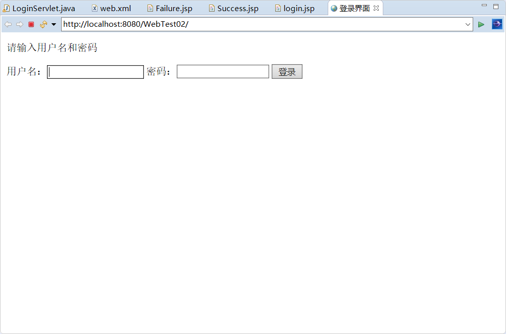<%@ page language="java" contentType="text/html; charset=UTF-8" pageEncoding="UTF-8"%> <!DOCTYPE html> <html> <head> <title>登录界面</title> </head> <body> <form action="LoginServlet" method = "post"> <p>请输入用户名和密码<p> 用户名:<input type="text" name = "user" > 密码:<input type = "password" name = "password"> <input type = "submit" value = "登录"> </form> </body> </html>