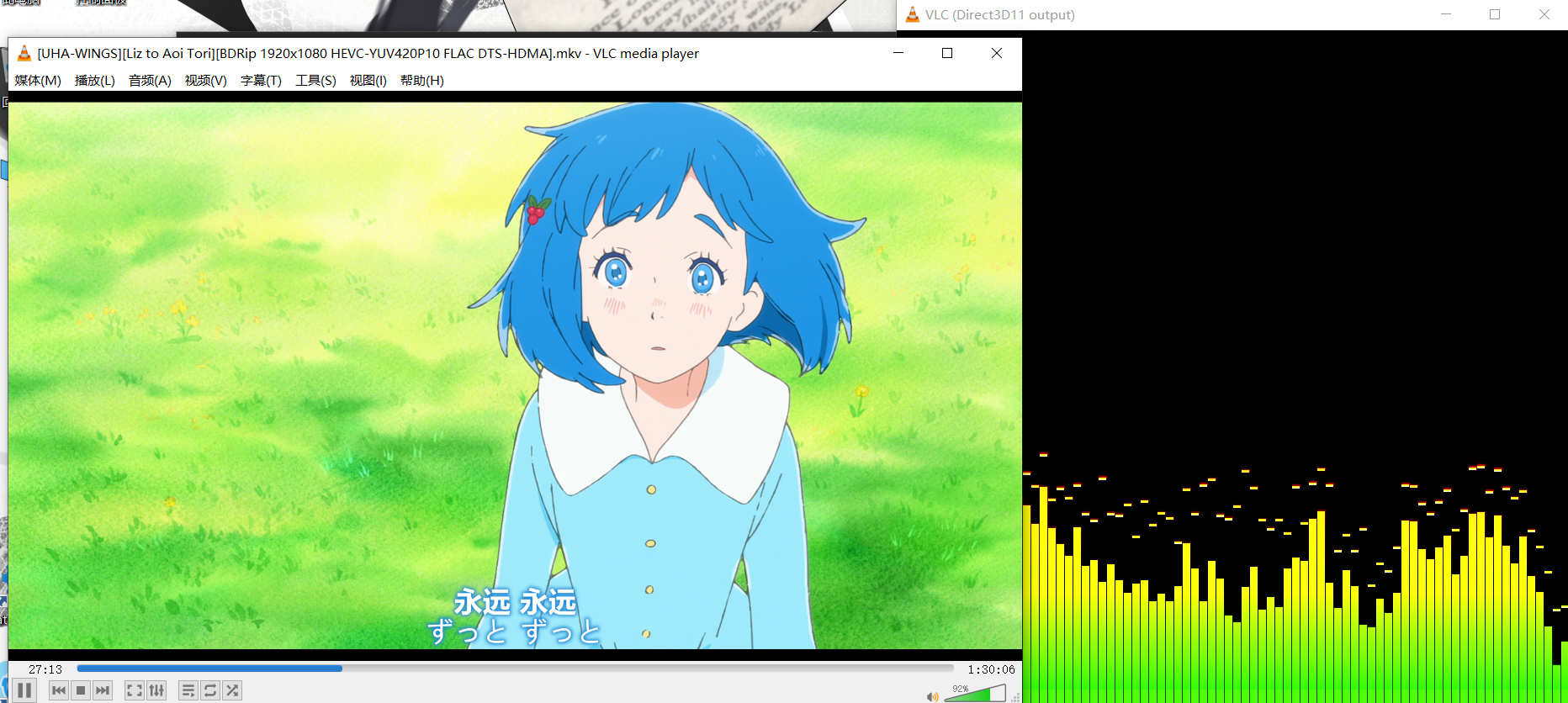 从上述使用截图可以看出,VLC的功能非常全面。它不仅拥有一个视频播放器所应有的所有功能,还具备很多进一步细致化个人播放体验的功能,包括但不限于播放网络视频、播放IPTV、播放直播串流、解析光盘文件、插入视频书签、自定义播放列表、调节播放速率、调节音频\字幕轨道。进一步地,它还拥有显示具体视频信息的内容,比如显示频谱,显示波形等内容,如下图所示
