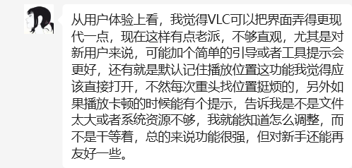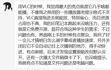 以下是这两位热心志愿者对VLC的使用体验回馈(微信聊天为zzt同学的调研记录,QQ聊天为笔者姐姐的调研记录)