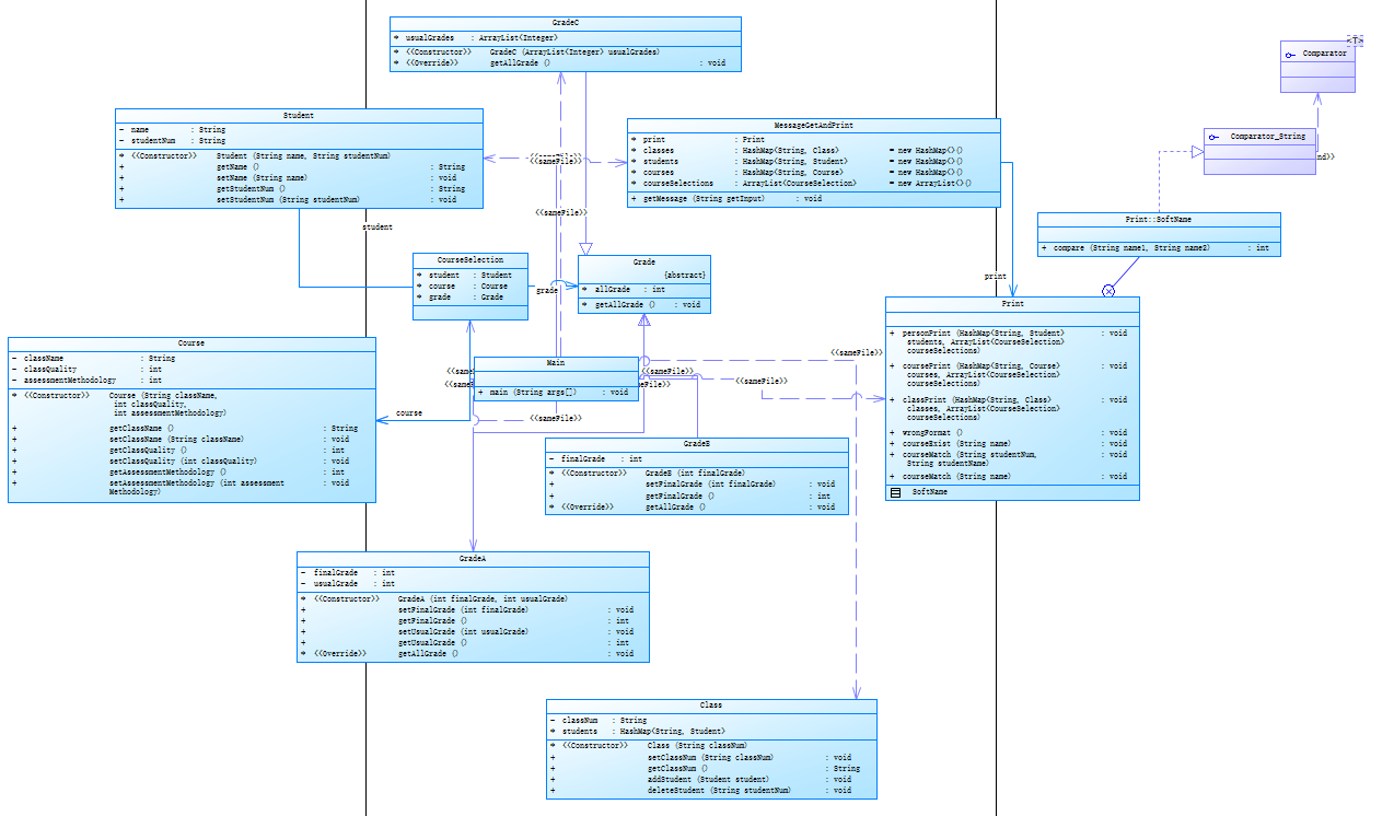 首先,我在两次成绩计算中的代码中,发现有些代码缺乏的注释和说明,尤其是在写2时,由于1写的比较早使用的一些方法比较简单粗暴不规范,这给理解以及后续的修改代码过程带来了一定的困难。真心建议在代码中多添加一些注释,对关键部分进行解释,以便他人或者未来的自己(?)能够更容易地理解代码的逻辑和功能。其次,我在代码中也注意到了一些命名不够规范和不一致的情况。为了提高代码的可读性和维护性,还是建议使用驼峰并且有意义且一致的变量和方法命名。这样在阅读代码时更加容易理解其含义,并且在后续的开发和维护过程中也更加方便。此外,代码中还存在一些硬编码的问题,即直接在代码中写入具体数值等信息。在处理用户输入和操作时,应该考虑到可能出现的异常情况,并进行相应的错误处理。这样的一些好习惯尤其在写一些比较长的代码需要时间长或者合作的时候的十分的有必要。