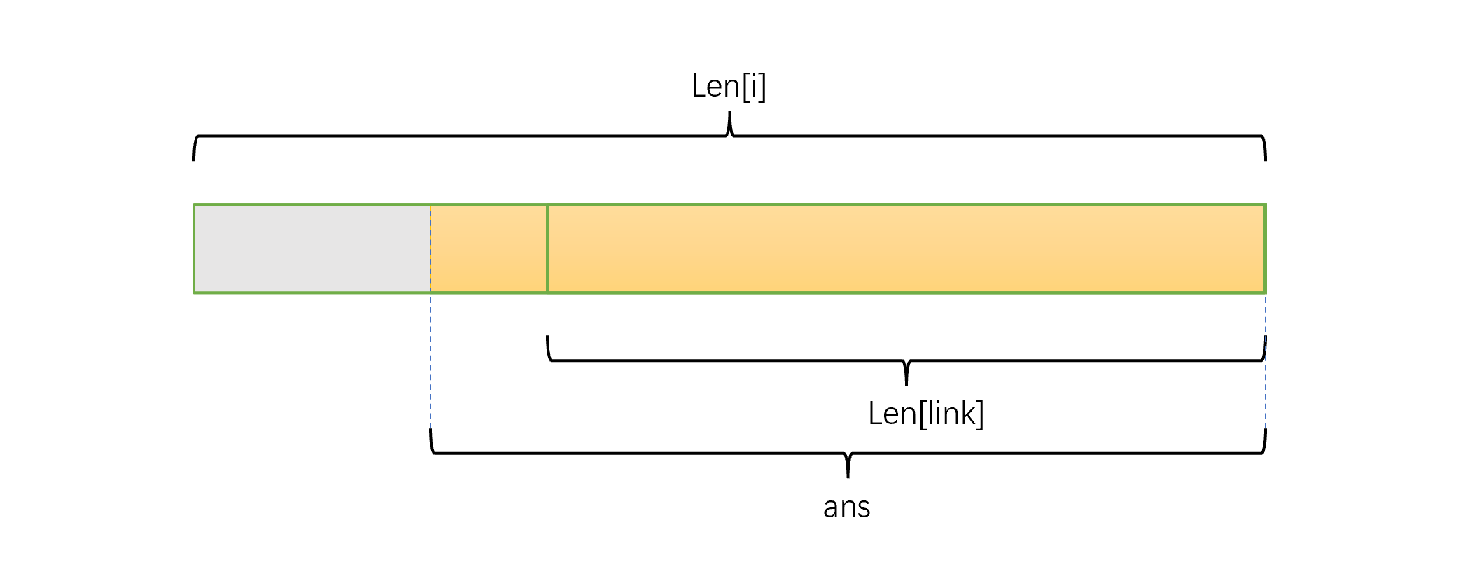 该节点表示的子串中,不是 \(s\) 的子串的就是上图的灰色部分,即 \(len_i-ans\);但可能存在 \(ans<len_{fa}\) 的情况,即该节点的 \(len_i-len_{fa}\) 个子串都不是 \(s\) 的子串,所以其贡献应该是 \(min(len_i-ans,len_i-len_{fa})\)。