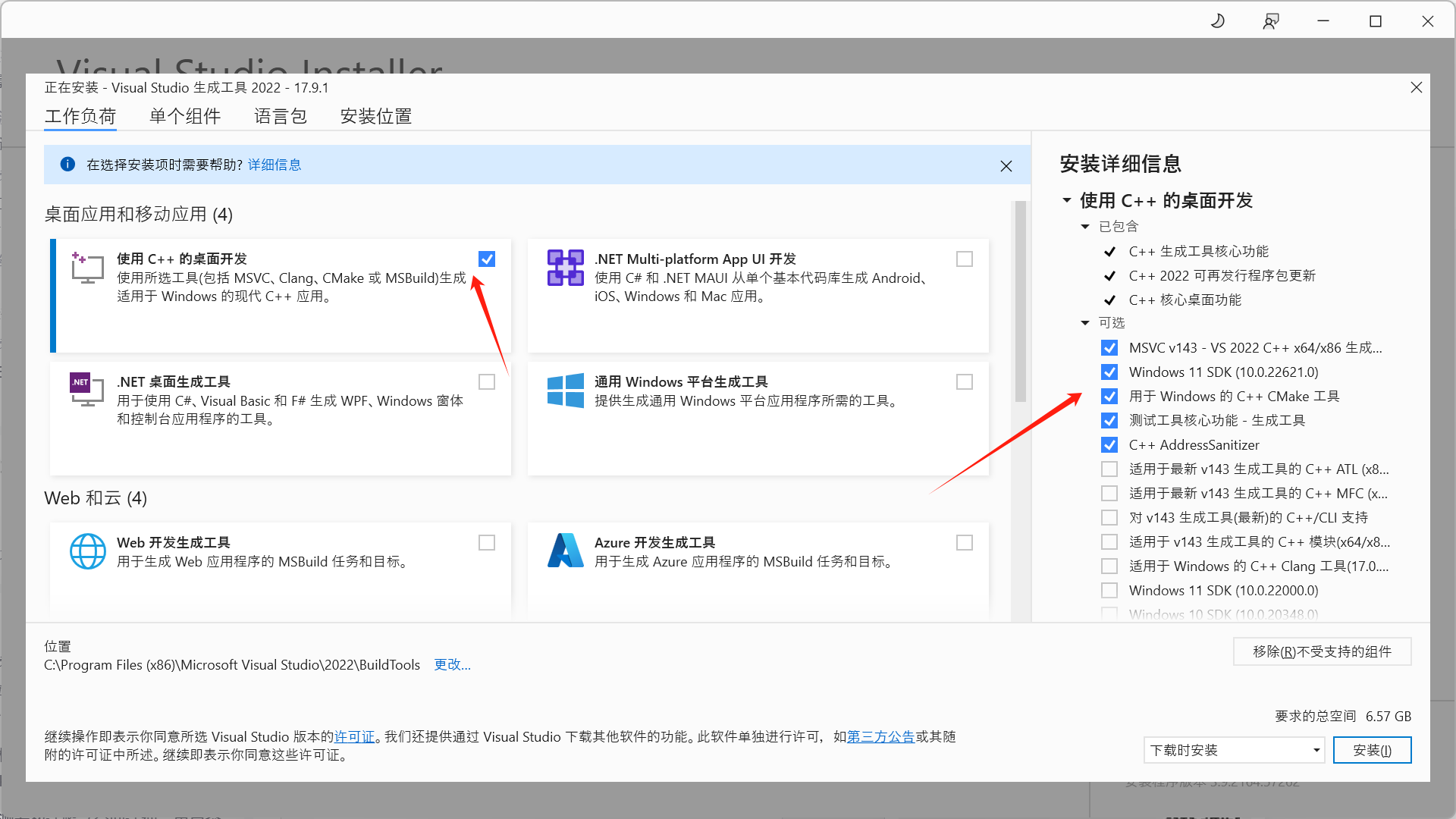 - 然后开始安装,在Workloads中,点击选择【C++ Bulids Tools】