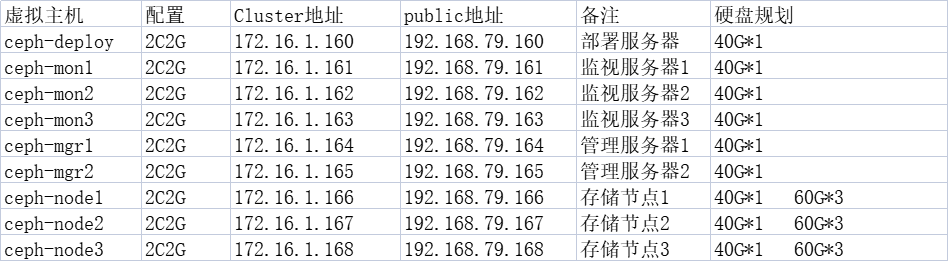 环境准备:计划采用9台虚拟机机分开部署,1台用于部署,3台监视,2台管理,最后3台存储节点,2个网段,一个用cluster,一个用于public