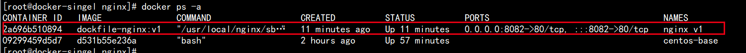 [root@docker-singel nginx]# docker run -d -p 8083:80 -v /wwwroot/:/usr/local/nginx/html --name nginx_v2 dockfile-nginx:v1