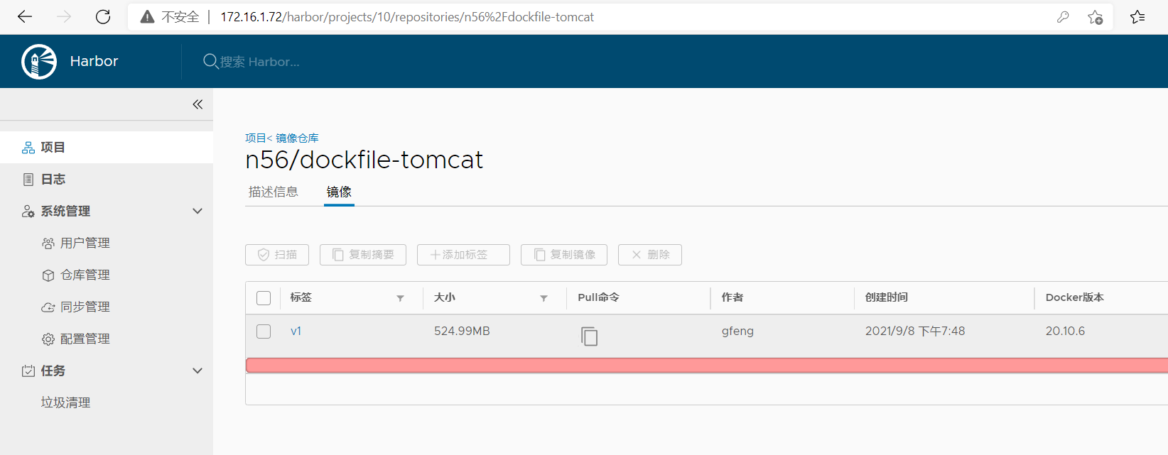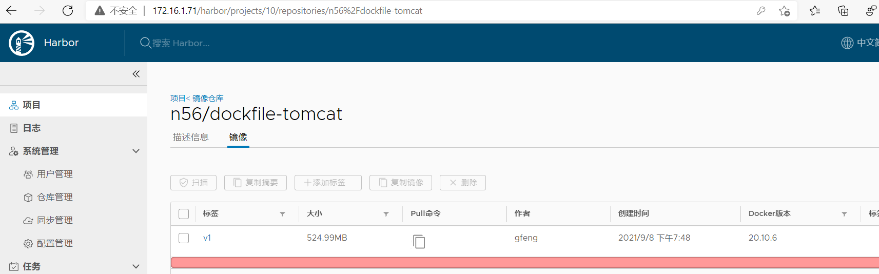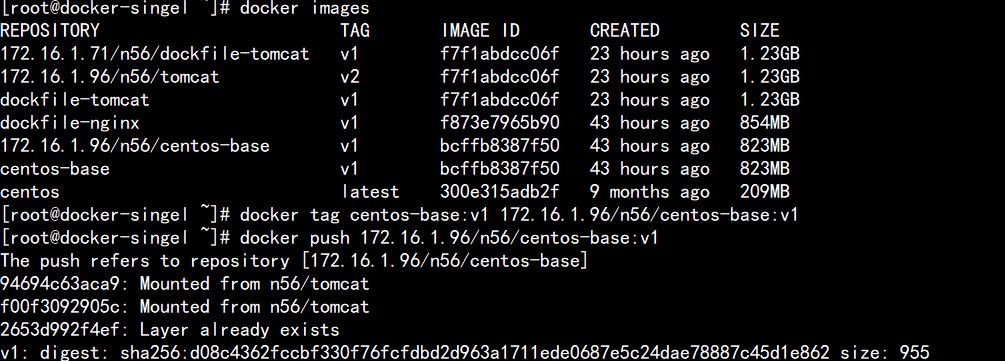 [root@docker-singel ~]# docker tag dockfile-tomcat:v1 172.16.1.71/n56/dockfile-tomcat:v1