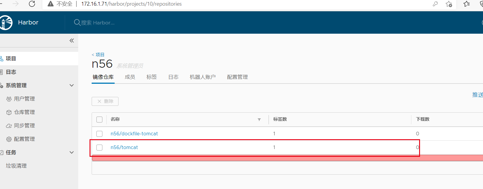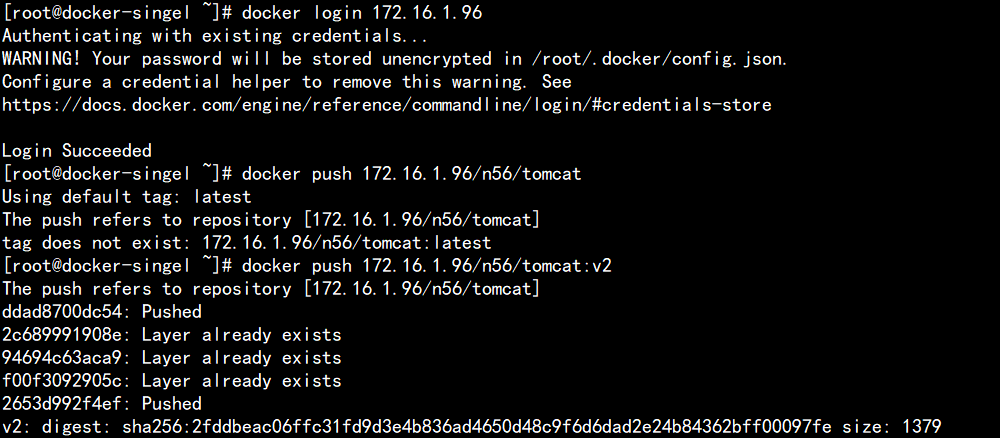 [root@docker-singel ~]# docker push 172.16.1.71/n56/dockfile-tomcat:v1
